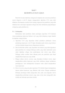 Coronavirus adalah suatu kelompok virus yang dapat menyebabkan penyakit pada hewan atau manusia. Infeksi COVID-19 dapat menimbulkan gejala ringan, sedang atau berat. Gejala klinis utama yang muncul yaitu demam (suhu > 38C), batuk dan kesulitan bernapas. Dalam keadaan yang seperti ini, adanya suatu sistem yang dapat mengetahui kondisi yang dapat mengidentifikasikan seseorang positif atau negatif covid-19 pastinya akan sangat membantu. Namun, dibutuhkan suatu metode yang memeliki tingkat akurasi yang tinggi dalam penerapannya kedalam sistem. Oleh karena itu, digunakan algoritma C5.0 untuk dapat melakukan diagnosis covid-19 berdasarkan dari gejala yang dialami seseorang. Algoritma C5.0 adalah salah satu algoritma klasifikasi, penyempurnaan dari algoritma sebelumnya yang dibentuk oleh Ross Quinlan pada tahun 1987, yaitu ID3 dan C4.5. Pada algoritma C5.0 terdapat suatu metode yang disebut dengan boosting, metode inilah yang menjadi salah satu kelebihan dari C5.0. Dengan adanya boosting, mampu meningkatkan akurasi dari pohon keputusan yang dibentuk oleh algortima C5.0, dimana cara kerjanya yaitu dengan mengacak dataset hingga menemukan akurasi yang lebih tinggi. Setelah terbentuknya pohon keputusan yang terbaik, akan dilakukan percobaan sebanyak sepuluh kali percobaan untuk mendapatkan nilai akurasi yang terbaik. Dari sepuluh percobaan tersebut diambil pohon keputusan yang memiliki nilai akurasi paling bersar. Pohon keputusan tersebut kemudian diuji dengan 545 data tes dan menghasilkan nilai accuracy sebesar 90,46 %, recall sebesar 94,76 % dan precision sebesar 93,48%. Kata kunci: covid-19, C5.0, boosting, pohon keputusan, coronavirus