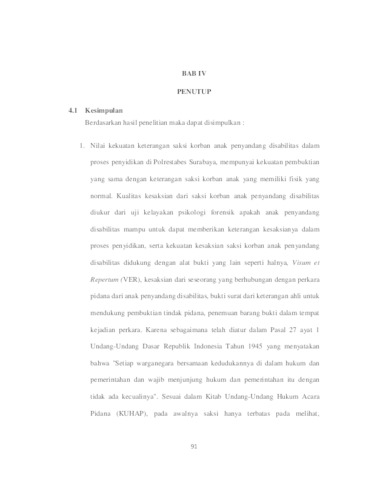 - KEDUDUKAN ALAT BUKTI KETERANGAN SAKSI KORBAN PEMERKOSAAN PADA PENYANDANG DISABILITAS (ANAK DIBAWAH UMUR) DALAM PROSES PEMBUKTIAN TINGKAT PENYIDIKAN (Studi Pada Unit PPA Satreskrim Polrestabes Surabaya). (deposited 27 Jul 2023 06:18) [Currently Displayed]