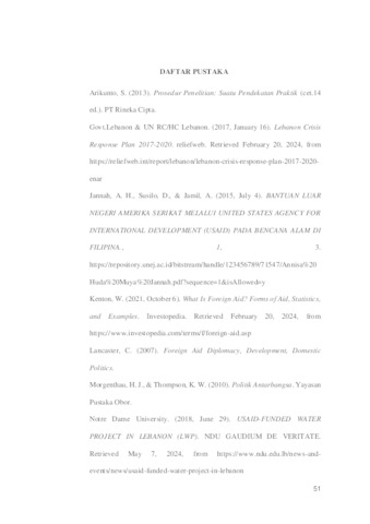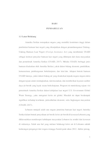 ABSTRAK Lebanon merupakan salah satu negara yang kurang beruntung dalam air bersih. Amerika Serikat sebagai negara yang memiliki visi untuk mengatasi krisiS air, telah mengirimkan USAID untuk memberikan bantuan luar negeri dalam bentuk Lebanon Water Project atau LWP. Tujuan dari penelitian ini untuk menganalisis bantuan luar negeri yang diberikan oleh USAID akan dianalisis melalui enam prinsip efektivitas yang terdiri dari: Country ownership over programs, Alignment, Harmonization, Transparency and accountability, Aid predictability, dan Civil society engagement and participation. Penelitian ini menggunakan tipe penelitian deskriptif dan metode analisis kualitatif menggunakan pengumpulan data dalam bentuk sekunder. Dengan terpenuhinya prinsip-prinsip dengan implementasi-implementasi dari LWP maka dapat dianggap bahwa LWP adalah bantuan luar negeri yang efektif dan telah membantu Lebanon mengurangi krisi air mereka. Kata Kunci: Lebanon Water Project, USAID, Efektivitas