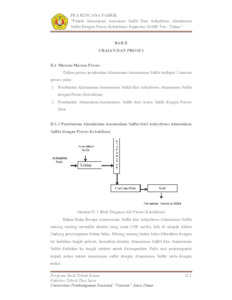 Planning of Aluminum Ammonium Sulphate Plant will be established in the area JIIPE Manyar, Gresik, East Java with consideration of location close to Highway. This factory uses a 24-hour continuous operating system with 330 working days and 264 employees. Production of Aluminum Ammonium Sulphate from Anhydrous Aluminum Sulphate and Ammonium Sulphate can be used as flocculants in the water purification process, raw materials for making deodorant, materials common in insect repellent sprays and others. In the process itself Anhydrous Aluminum Sulphate and Ammonium Sulphate are purchased with solid phase (powder) stored in storage tanks under conditions of 30°C temperature and pressure 1 atm. Both materials are dissolved first using a tank solvent, for Anhydrous Aluminum Sulphate material after material is dissolved flowed into the clarifier for separation between impurities and impurities the solution. After the two ingredients are dissolved, they are flowed to the heater to heating is carried out until the temperature reaches 90°C. Then the ingredients are put in into the reactor to be processed into Aluminum Ammonium Sulfate. Product flowed to the evaporator to be concentrated with hope before entering Into the crystalizer the solution has become saturated. On the crystalizer of the material in The crystallization then goes into the centrifudge for separation between Aluminum Ammonium Sulfate crystals and mother liquor. Crystal then Put in a rotary dryer to dry using hot air. After that the crystal is cooled using a cooling conveyor and so on Go to the ball mill to do size uniformity. After that log in into the silo as the final product of Aluminum Ammonium Sulphate crystals then Packed in 50 kg sacks and then marketed.