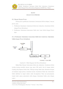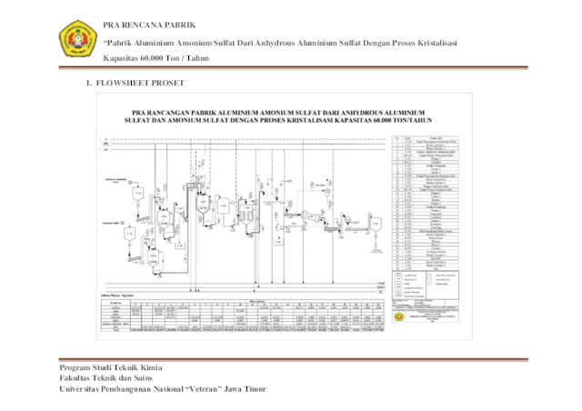 Planning of Aluminum Ammonium Sulphate Plant will be established in the area JIIPE Manyar, Gresik, East Java with consideration of location close to Highway. This factory uses a 24-hour continuous operating system with 330 working days and 304 employees. Production of Aluminum Ammonium Sulphate from Anhydrous Aluminum Sulphate and Ammonium Sulphate can be used as flocculants in the water purification process, raw materials for making deodorant, materials common in insect repellent sprays and others. In the process itself Anhydrous Aluminum Sulphate and Ammonium Sulphate are purchased with solid phase (powder) stored in storage tanks under conditions of 30°C temperature and pressure 1 atm. Both materials are dissolved first using a tank solvent, for Anhydrous Aluminum Sulphate material after material is dissolved flowed into the clarifier for separation between impurities and impurities the solution. After the two ingredients are dissolved, they are flowed to the heater to heating is carried out until the temperature reaches 90°C. Then the ingredients are put in into the reactor to be processed into Aluminum Ammonium Sulfate. Product flowed to the evaporator to be concentrated with hope before entering Into the crystalizer the solution has become saturated. On the crystalizer of the material in The crystallization then goes into the centrifudge for separation between Aluminum Ammonium Sulfate crystals and mother liquor. Crystal then Put in a rotary dryer to dry using hot air. After that the crystal is cooled using a cooling conveyor and so on Go to the ball mill to do size uniformity. After that log in into the silo as the final product of Aluminum Ammonium Sulphate crystals then Packed in 50 kg sacks and then marketed.
