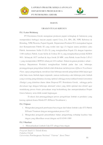 Departemen Produksi menghasilkan limbah padat dan cair, beberapa penanggulangan pengolahan limbah telah dilakukan melalui proses Effluent Treathment Plant, upaya pengendapan, netralisasi dan beberapa metode pengolahan lebih lanjut agar nilai baku mutu limbah dapat terpenuhi, namun realisasinya ada beberapa jenis limbah yang exsisting pengolahannya kurang optimal sehingga menyisahkan bentuk konsentrat (Sludge) yang ditimbun diarea lahan Disposal PT. Petrokimia Gresik , sehingga perlu dievaluasi lagi terkait proses pengelolaan limbah ex.produksi yang kurang optimal diarea Pabrik ET (Effluent Trearhment ), dengan memberikan salah satu alternatif solusi yang lebih optimal dan efektif agar mendukung proses bisnis perusahaan tetap berkembang dan mempertahankan Proper Green Industry serta lebih ramah lingkungan