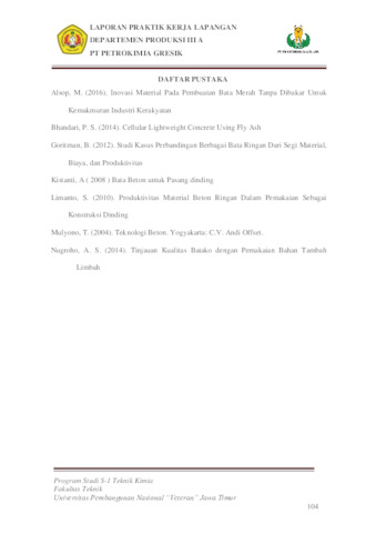 Darmawan, Moch Iqbal (2024) PEMBUATAN KOMPOSISI BATU BATA CLC DARI LIMBAH EX.PRODUKSI EFFLUENT TREATHMENT PLANT DEPARTEMEN PRODUKSI III A PT.PETROKIMIA GRESIK. Project Report (Praktek Kerja Lapang dan Magang). FACULTY ENGINEERING UPN VETERAN JAWA TIMUR. (Unpublished)
