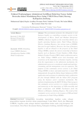 Edukasi Pendampingan Administrasi Sertifikasi Halal dan Nomor Induk Berusaha dalam Mendukung Daya Saing UMKM Desa Pakel, Bareng, Kabupaten Jombang, 2 (3).
