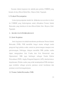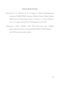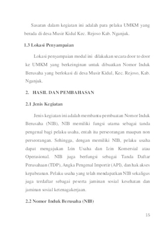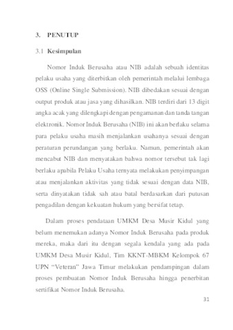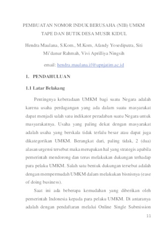 Fakhiroh, Luqy Aizzatul and Rahmah, Siti Mi’danur and Fitrianata, Muhammad Ikhsan and Nakrowiyah, Finda Rohmatin and Ningsih, Vivi Aprilliya and BR Sijabat, Riris Oktauli and Cahyaningrum, Fatma Endah and Handayani, Alfia Indah and Sekar Sari, Nina Zenitha and Yosediputra, Afandy (2023) MODUL PENGABDIAN MASYARAKAT KULIAH KERJA NYATA TEMATIK MBKM TAHUN 2023 “PEMBUATAN NOMOR INDUK BERUSAHA (NIB) UMKM TAPE DAN BUTIK DESA MUSIR KIDUL“. modul pengabdian masyarakat. (Unpublished)