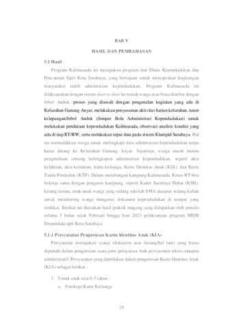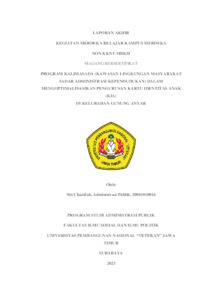 Chanifah, Siti (2024) PROGRAM KALIMASADA (KAWASAN LINGKUNGAN MASYARAKAT SADAR ADMINISTRASI KEPENDUDUKAN) DALAM MENGOPTIMALISASIKAN PENGURUSAN KARTU IDENTITAS ANAK (KIA) DI KELURAHAN GUNUNG ANYAR. FAKULTAS ILMU SOSIAL DAN ILMU POLITIK, SURABAYA. (Unpublished)