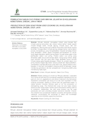 Anggoro, Achmad Rahditya Viman and Aprilianty, Syasmitha Lucky and Arianti, Rahma Dea and Meydyanti, Annisa Rachma and Khaq, Dwi Nur Arinal (2023) PEMBUATAN SABUN CUCI PIRING DARI MINYAK JELANTAH DI KELURAHAN KEMUTERAN, GRESIK, JAWA TIMUR. ETAM : JURNAL PENGABDIAN KEPADA MASYARAKAT, Samarinda.