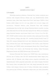 This research aimed to provide an overview of the implementation of the partnership between the Surabaya City Government and UNICEF in efforts to eradicate violence against children in Surabaya in 2021-2023. This research uses the concept of violence and protection against children. Apart from that, this research also uses Finnemore & Sikkink's norm life cycle theory to explain the norm internalization process carried out by the Surabaya City Government in an effort to become a Child Friendly City in the world. The author also uses Ali Khamdan's international partnership theory regarding partnership steps. Qualitative data analysis techniques were used in this research by applying interview methods at related agencies, observations, and also the use of documents. Based on the research results, the implementation of the Surabaya City Government partnership in overcoming child violence in Surabaya was carried out through 8 stages of Ali Khamdan's partnership starting from problem recognition to the monitoring stage. This stage was carried out by the Surabaya City Government, assisted by UNICEF as a partner, in order to overcome the problem of child violence while achieving a Child Friendly City. The implementation of this partnership is still in process after the signing of the MoU, several activities have been carried out, such as correspondence regarding the partnership carried out by the Surabaya City Government to Bappenas and UNICEF, UNICEF's visit to Surabaya, starting from the preparation of work programs to the monitoring process coordinated by Bappeda. Keywords: Violence against Children in Surabaya, Child Protection, Surabaya City Government, UNICEF, International Partnership
