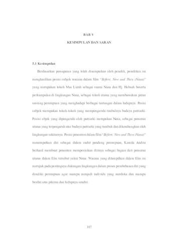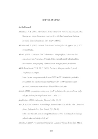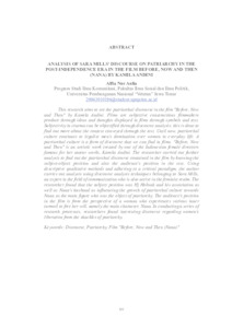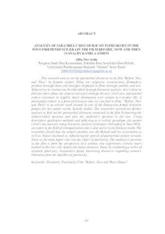 Penelitian ini bertujuan melihat bagaimana wacana patriarki dalam film "Before, Now and Then" karya Kamila Andini. Film merupakan konstruksi subjektif yang diproduksi oleh para sineas melalui ide dan pemikiran yang ditampilkan dalam film melalui simbol dan teks. Subjektivitas dalam film mampu di objektifikasi melalui analisis wacana, hal tersebut dilakukan guna mengetahui lebih dalam konteks yang tersampaikan melalui teks. Hingga saat ini, budaya patriarki terus melegalkan dominasi laki-laki atas perempuan dalam kehidupan sehari-hari. Budaya patriarki merupakan salah satu bentuk wacana yang dapat kita temui pada film. “Before, Now and Then” merupakan karya sineas yang dicipta oleh salah satu sutradara perempuan Indonesia yang terkenal dengan karya auteurnya, Kamila Andini. Peneliti melakukan analisis lebih lanjut untuk mengetahui wacana patriarki yang terdapat pada film tersebut dengan mengetahui bagaimana posisi subjek-objek dan juga posisi penonton dalam teks. Dengan menggunakan metode kualitatif deskriptif dan berpegang pada paradigma kritis, peneliti melakukan analisis menggunakan teknik analisis wacana milik Sara Mills, ahli bidang komunikasi yang juga aktif dalam ranah feminis. Peneliti menemukan bahwa posisi subjek merupakan Hj Hobsah dan perkumpulannya serta suami Nana sebagai yang mempengaruhi tumbuhnya budaya patriarki terhadap Nana sebagai tokoh utama yang menjadi objek patriarki. Posisi penonton dalam film berada pada sudut pandang seorang perempuan yang mengalami berbagai gejolak batin untuk dapat membebaskan kehendak dirinya, yakni Sang tokoh utama, Nana. Dalam melakukan serangkaian proses penelitian, peneliti menemukan wacana menarik mengenai pembebasan perempuan dalam belenggu patriarki. Kata Kunci : Wacana, Patriarki, Film “Before, Now and Then (Nana)” This research aims to see the patriarchal discourse in the film "Before, Now and Then" by Kamila Andini. Films are subjective constructions filmmakers produce through ideas and thoughts displayed in films through symbols and text. Subjectivity in cinema can be objectified through discourse analysis; this is done to find out more about the context conveyed through the text. Until now, patriarchal culture continues to legalize men's domination over women in everyday life. A patriarchal culture is a form of discourse that we can find in films. "Before, Now and Then" is an artistic work created by one of the Indonesian female directors famous for her auteur works, Kamila Andini. The researcher carried out further analysis to find out the patriarchal discourse contained in the film by knowing the subject-object position and also the audience's position in the text. Using descriptive qualitative methods and adhering to a critical paradigm, the author carries out analysis using discourse analysis techniques belonging to Sara Mills, an expert in the field of communication who is also active in the feminist realm. The researcher found that the subject position was Hj Hobsah and his association as well as Nana's husband as influencing the growth of patriarchal culture towards Nana as the main figure who was the object of patriarchy. The audience's position in the film is from the perspective of a woman who experiences various inner turmoil to free her will, namely the main character, Nana. In conducting a series of research processes, researchers found interesting discourse regarding women's liberation from the shackles of patriarchy. Keywords: Discourse, Patriarchy, Film "Before, Now and Then (Nana)"