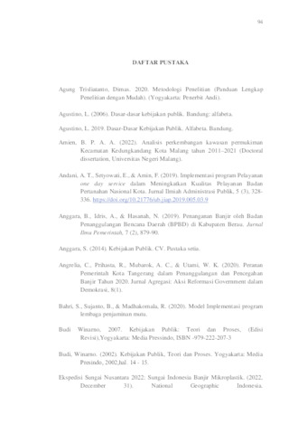 Malang City is one of the cities in East Java that has experienced a total of 700 flood events since 2019 (BPBD’s data) and has made flooding a routine problem for the local government. This phenomenon is the basis for the emergence of a flood management by the Dinas PUPR-PKP Malang City as stated in the RPJMD 2018-2023. This research uses a descriptive qualitative research design to collect written data through interviews, documentation, and observation. The research results show that flood management policies have been implemented quite well in Malang City. In this implementation, the Dinas PUPR-PKP Malang City collaborates with contractors in building drainage construction and infiltration well projects. The obstacle in implementing this policy is that there are still people who are not willing to have their home area be the implementation site, whether for drainage normalization, drainage constructions or absorption well projects. Efforts by the Dinas PUPR-PKP Malang City to provide understanding to the public regarding the urgency of handling floods through this policy need to be carried out.