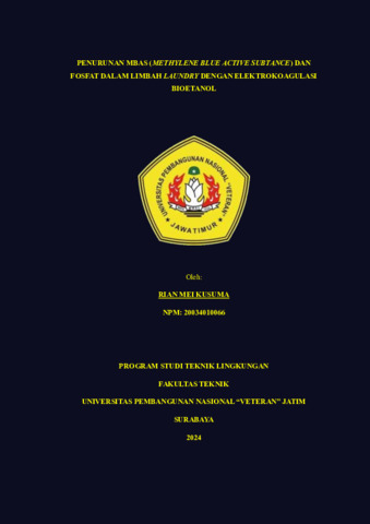 Kusuma, Rian Mei (2024) PENURUNAN MBAS (METHYLENE BLUE ACTIVE SUBTANCE) DAN FOSFAT DALAM LIMBAH LAUNDRY DENGAN ELEKTROKOAGULASI BIOETANOL. Undergraduate thesis, UPN "Veteran" Jawa Timur.