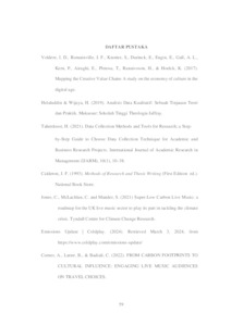 ABSTRAKSI Industri seni pertunjukan global merupakan ekosistem yang kompleks dengan berbagai pemangku kepentingan. Tur konser besar seperti Green Concert Coldplay pada tur Music of the Spheres menghadirkan studi kasus yang menarik untuk menganalisis rantai nilai seni pertunjukan global. Menggunakan konsep green concert untuk visi konser yang berkelanjutan dibantu dengan Warner Music Group, Parlophone Music, dan beberapa perusahaan yang turut berkontribusi untuk mewujudkan strategi Coldplay dalam green concert. Melalui konsep yang digunakan dapat dilihat bagaimana proses pemetaan yang terjadi mulai dari kreasi hingga eksibisi yang ada pada green concert Coldplay “Music of The Spheres”. Metode yang digunakan dalam penelitian berikut berupa deskriptif-kualitatif yang digunakan untuk menjabarkan fenomena Global Performing Arts Value Chain yang ada pada green concert Coldplay “Music of The Spheres”. Hasil yang akan didapat melalui penelitian ini berupa proses produksi green concert Coldplay “Music of The Spheres” yang telah melewati seluruh tahapan pada bagian utama mulai dari kreasi hingga eksibisi. Kata Kunci: green concert, Global Value Chain, Performing Arts Value Chain.