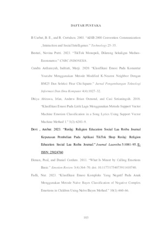 TikTok Shop adalah fitur di platform TikTok yang memungkinkan pengguna melihat dan membeli produk langsung dari aplikasi tanpa keluar dari aplikasi. Ditutupnya TikTok Shop dikarenakan adanya kecurigaan hadirnya Project S yang merugikan UMKM serta melanggar Permendag nomor 31 tahun 2023 karena melakukan transaksi jual beli pada platform media sosial Tiktok. Masyarakat memberikan tanggapan dan pendapat yang berbeda di komentar YouTube tentang ditutupnya TikTok Shop. Ada yang memberikan komentar marah, sedih, senang, takut, dan terkejut. Dari sinilah diperlukannya klasifikasi terhadap kebijakan pemerintah ditutupnya tiktok shop untuk melihat tanggapan atau komentar dari masyarakat mengenai kebijakan tersebut. Untuk melakukannya diperlukannya suatu proses untuk mengklasifikasikan atau mengkategorikan komentar tersebut sesuai emosi, proses tersebut di sebut Emotion Recognition. Dengan begini pemerintah dapat mengetahui secara cepat dan tepat emosional masyarakat melalui data komentar sehingga dapat mengambil keputusan untuk kepentingan masyarakat. Emotion Recognition adalah proses mengklasifikasikan atau mengkategorikan komentar tersebut sesuai emosi. Oleh karena itu, Emotion Recognition dapat digunakan sebagai refrensi untuk pengambilan keputusan oleh stakeholder. Emotion Recognition dilakukan menggunakan metode Naive Bayes dan pembobotan kata Term Frequency – Inverse Document Frequency (TF-IDF). Dalam Emotion recognition untuk mencari akurasi terbaik dilakukan 5 skenario yaitu, skenario 1 dengan training model menggunakan hyperparameter (alpha=0.1, fit_prior=True) menggunakan model multinomial Naive Bayes. Skenario 2 dengan dilakukan training model menggunakan hyperparameter (alpha=1.0, binarize=0.0, fit_prior=True) menggunakan model bernoulli Naive Bayes. Skenario 3 dengan training model menggunakan Bernaoulli Naive Bayes tanpa hyperparameter. Skenario 4 dengan dilakukan training model menggunakan Bernaoulli Naive Bayes dengan hyperparameter (alpha=1.0, binarize=0.5, fit_prior=False). Skenario 5 dengan dilakukan training model menggunakan Multinomial Naive Bayes tanpa hyperparameter. Model dengan accuracy terbaik yaitu pada skenario 1 dengan accuracy 82 %. Hasil dari uji validasi dilakukan dengan menggunakan 115 data baru, 17 emosi marah dari 38 data yang bernilai benar, 15 emosi sedih dari 16 data bernilai benar, 13 emosi senang dari 26 data bernilai benar, 14 emosi takut dari 17 data bernilai benar, dan 9 emosi terkejut dari 18 data yang bernilai benar. Sehingga presentase accuracy model adalah 0.78 atau 78%.