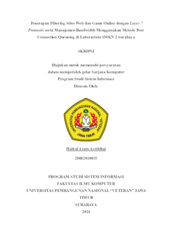 Assiddiqi, Haikal Azam (2024) PENERAPAN FILTERING SITUS WEB DAN GAME ONLINE DENGAN LAYER 7 PROTOCOLS SERTA MANAJEMEN BANDWIDTH MENGGUNAKAN METODE PEER CONNECTION QUEUEING DI LABOTARIUM SMKN 2 SURABAYA. Undergraduate thesis, Universitas Pembangunan Nasional Veteran Jawa Timur.