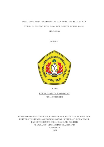 Ramadhan, Reksa Daninzia (2024) Pengaruh Strategi Promosi Dan Kualitas Pelayanan Terhadap Minat Beli Pada Dee Coffee House Waru Sidoarjo. Undergraduate thesis, UPN "Veteran" Jawa Timur.