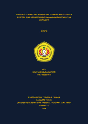 Rahmawati, Kavita Angel (2024) Pengaruh Konsentrasi Asam Sitrat Terhadap Karakteristik Ekstrak Buah Kecombrang (Etlingera elatior) Dan Stabilitas Warnanya. Undergraduate thesis, UPN Veteran Jawa Timur.