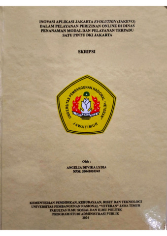 Lydia, Angelia Devika (2024) INOVASI APLIKASI JAKARTA EVOLUTION (JAKEVO) DALAM PELAYANAN PERIZINAN ONLINE DI DINAS PENANAMAN MODAL DAN PELAYANAN TERPADU SATU PINTU DKI JAKARTA. Undergraduate thesis, UPN Veteran Jawa Timur.