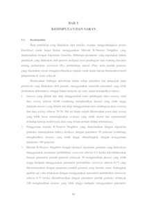 Weather is a condition of the atmosphere observed over a relatively short or brief period within a limited territory. The advancement of technology today significantly aids humanity, particularly in weather observation such as the classification of daily rainfall. One of the methods utilized is the K-NN method along with genetic algorithms. Weather and climate changes can be influenced by many factors such as temperature, humidity, air pressure, wind speed, wind direction at maximum speed, duration of sunlight, and rainfall. Therefore, this study conducted a "Classification of daily rainfall using the KNN method with genetic algorithm optimization," with the expected output being the accuracy level of the applied methods. The results of this research indicate that datasets trained and tested using a data training and data testing ratio of 60:40 tend to yield higher accuracy levels. The K-Nearest Neighbor method with genetic algorithm optimization, executed using a parameter of 50 generations, tends to produce higher accuracy levels. Additionally, the K-Nearest Neighbor method with genetic algorithm optimization, executed using a crossover probability parameter of 0.5 when combined with a parameter of 50 generations, yields greater accuracy compared to using a crossover probability parameter of 0.75 combined with the same number of generations.