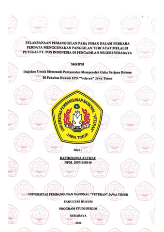 Althaf, Rafikhansa (2024) PELAKSANAAN PEMANGGILAN PARA PIHAK DALAM PERKARA PERDATA MENGGUNAKAN PANGGILAN TERCATAT MELALUI PETUGAS PT. POS INDONESIA DI PENGADILAN NEGERI SURABAYA. Undergraduate thesis, UPN Veteran Jawa Timur.