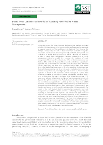Hertati, Diana and Nurhadi, Nurhadi and Tukiman, Tukiman (2023) Penta Helix Collaboration Model in Handling Problems of Waste Management. In: 7st International Seminar of Research Month 2022, Surabaya.