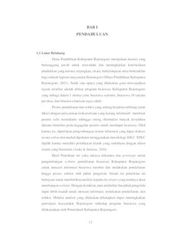 Dinas Pendidikan Kabupaten Bojonegoro merupakan instuisi yang bertanggung jawab untuk mewadahi dan meningkatkan ketersediaan pendidikan yang merata, terjangkau, setara, berkelanjutan serta berkeadilan bagi seluruh lapisan masyarakat Bojonegoro. Salah satu upaya yang dilakukan guna mewujudkan tujuan tersebut adalah dibuatnya program beasiswa Kabupaten Bojonegoro yang terbagi dalam 3 skema yaitu beasiswa scientist, beasiswa 10 sarjana per desa, dan beasiswa bantuan tugas akhir. Proses pendaftaran masih menggunakan proses pendaftaran dan seleksi secara konvensial. Dari hasil survei, 8 dari 10 pendaftar menyatakan bahwa proses pendaftaran dan seleksi dianggap kompleks dan kurang jelas dalam hal persyaratan, yang menyulitkan pemahaman peserta dan seringkali mengakibatkan kesalahan, yang pada akhirnya menyebabkan peserta gagal mendapatkan beasiswa. Diperlukan adanya analisis dan desain sistem pendaftaran dan seleksi beasiswa di Kabupaten Bojonegoro. Pembuatan prototype dilakukan dengan menerapkan metodologi SDLC sampai dengan tahap design. Dari prototype yang dihasilkan dan diuji, nilai yang didapat yaitu 88. Angka tersebut menunjukkan bahwa rancangan sistem ini dapat memenuhi kebutuhan dan harapan calon pengguna, serta memberikan kemudahan dan kualitas dalam penggunaan sistem secara keseluruhan.