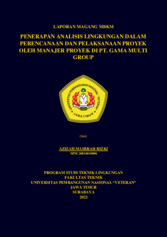 Rizki, Azizah Mahirah (2022) PENERAPAN ANALISIS LINGKUNGAN DALAM PERENCANAAN DAN PELAKSANAAN PROYEK OLEH MANAJER PROYEK DI PT. GAMA MULTI GROUP. Project Report (Praktek Kerja Lapang dan Magang). Universitas Pembangunan Nasional Veteran Jawa Timur, Surabaya, Indonesia.