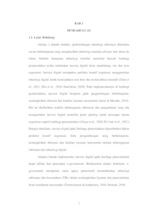 Inovasi digital pada bidang pemerintahan dapat terlihat pada penerapan e-government. Di Indonesia, banyak lembaga pemerintahan yang menerapkan e-government salah satunya DISKOMINFO JATIM. Akan tetapi, terdapat permasalahan penerapan inovasi digital seperti e-government tidak terintegrasi, teknologi yang tidak memadai, aplikasi yang masih minim, dan keterampilan TIK aparat negara yang masih belum memadai. Skripsi ini bertujuan untuk melakukan analisis pengaruh faktor kesuksesan implementasi inovasi digital dengan hasil dari penelitian ini adalah hasil olahan data penelitian dan rekomendasi untuk DISKOMINFO JATIM dalam meningkatkan kesuksesam implementasi inovasi digital. Peneliti menggunakan Digital Innovation Model dengan melibatkan 196 pegawai DISKOMINFO JATIM sebagai responden kuesioner skripsi. Dari hasil yang didapatkan menunjukkan bahwa semua variabel Digital Innovation Model mempengaruhi kesuksesan implementasi inovasi digital pada DISKOMINFO JATIM secara positif. Akan tetapi, nilai rata-rata (mean) dari tiap indikator memiliki nilai dibawah 3,5 yang menunjukkan masih terdapat pegawai DISKOMINFO JATIM yang masih belum dapat mengimplementasikan inovasi digital dengan baik. Melalui hasil tersebut, peneliti merekomendasikan untuk meningkatkan kesiapan organisasi, budaya digital organisasi, kapabilitas digital, serta proses inovasi digital pada DISKOMINFO JATIM dengan mulai menciptakan kebijakan atau SOP yang fleksibel dan terbuka akan teknologi digital serta melakukan pelatihan untuk meningkatkan keterampilan digital tiap pegawai.