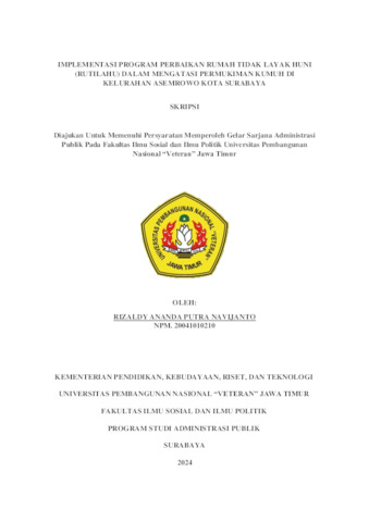 ANANDA PUTRA NAVIJANTO, RIZALDY (2024) IMPLEMENTASI PROGRAM PERBAIKAN RUMAH TIDAK LAYAK HUNI (RUTILAHU) DALAM MENGATASI PERMUKIMAN KUMUH DI KELURAHAN ASEMROWO KOTA SURABAYA. Undergraduate thesis, UPN Veteran Jawa Timur.