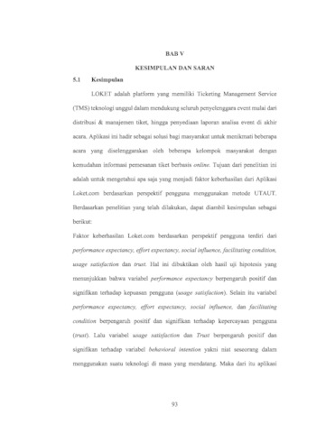 Loket.com is a platform that offers a superior Ticketing Management Service (TMS) technology to support all event organizers from ticket distribution to management. Some users interviewed found the application to be user-friendly. However, the payment system within the application caused some difficulty for those unfamiliar with e-ticketing payment systems. The purpose of this thesis is to analyze the Behavioral Intention of Loket.com users residing in Surabaya towards the application. This thesis uses the Unified Theory of Acceptance and Use of Technology (UTAUT) model with seven variables: performance expectancy, effort expectancy, social influence, facilitating condition, usage satisfaction, trust, and behavioral intention. The sample was taken using Non-Probability sampling with a Purposive Sampling technique. The number of samples in this thesis is 400 Loket.com users residing in Surabaya. The data obtained were then analyzed using PLS-SEM with SmartPLS 3 software. The results of this study indicate that the performance expectancy variable has a positive and significant effect on usage satisfaction. Additionally, the performance expectancy, effort expectancy, social influence, and facilitating condition variables have a positive and significant effect on trust. Furthermore, the usage satisfaction and trust variables have a positive and significant effect on the behavioral intention variable, which is a person's intention to use a technology in the future.