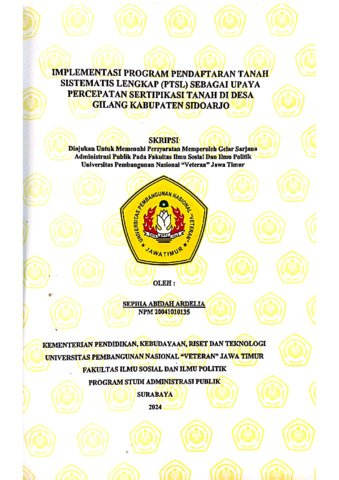 Ardelia, Sephia Abidah (2024) Implementasi Program Pendaftaran Tanah Sistematis Lengkap (PTSL) Sebagai Upaya Percepatan Sertipikasi Tanah di Desa Gilang Kabupaten Sidoarjo. Undergraduate thesis, UPN Veteran Jawa Timur.