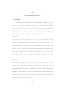Dinas Sosial mempunyai peran dalam menyediakan pelayanan kepada publik, termasuk kepada penyandang disabilitas mental. Dalam perannya dinas sosial diharapkan mampu untuk mengatasi permasalahan yang dihadapi oleh penyandang disabilitas mental. Dalam hal ini, Dinas Sosial Kabupaten Jombang berupaya untuk mengatasi permasalah yang dialami oleh penyandang disabilitas mental di Kabupaten Jombang melalui program Karepe Dimesemi Bojo yang merupakan singkatan dari Kawasan Rehabilitasi Penyandang Disabilitas Mental Sejahtera Mandiri Kabupaten Jombang. Tujuan dari program ini untuk meningkatkan peran masyarakat disabilitas mental di seluruh wilayah Kabupaten Jombang dalam aktivitas produktif. Namun, dalam pelaksanaan program Karepe Dimesemi Bojo masih ditemukan permasalahan yang perlu dilakukan tahapan evaluasi. Penelitian ini bertujuan untuk mendiskripsikan dan menganalisa mengenai evaluasi program Karepe Dimesemi Bojo bagi penyandang disabilitas mental di Dinas Sosial Kabupaten Jombang. Metode penelitian ini adalah deskriptif kualitatif dengan teknik wawancara, observasi, dan dokumentasi. Teori yang digunakan pada penelitian ini adalah teori evaluasi William N Dunn yang terdapat enam faktor yaitu, efektivitas, efisiensi, kecukupan, perataan, responsivitas, dan ketepatan. Hasil dari penelitian menunjukkan bahwa evaluasi program Karepe Dimesemi Bojo bagi penyandang disabilitas mental di Dinas Sosial Kabupaten Jombang belum optimal. Dari enam faktor masih ditemukan tiga faktor yang belum berjalalan optimal yaitu, efektivitas, kecukupan, dan perataan. Sedangkan tiga faktor lainnya yaitu, efisiensi, responsivitas, dan ketepatan sudah berjalan optimal. Kata Kunci: Evaluasi, Program Karepe Dimesemi Bojo, Dinas Sosial