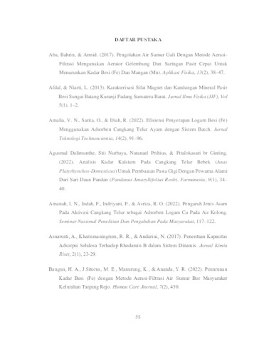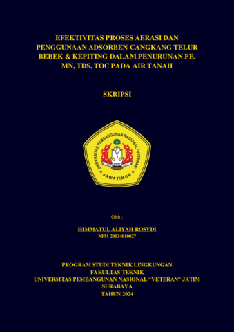 Rosydi, Himmatul Aliyah (2024) EFEKTIVITAS PROSES AERASI DAN PENGGUNAAN ADSORBEN CANGKANG TELUR BEBEK & KEPITING DALAM PENURUNAN FE, MN, TDS, TOC PADA AIR TANAH. Undergraduate thesis, UPN Veteran Jawa Timur.