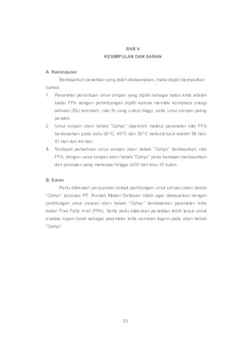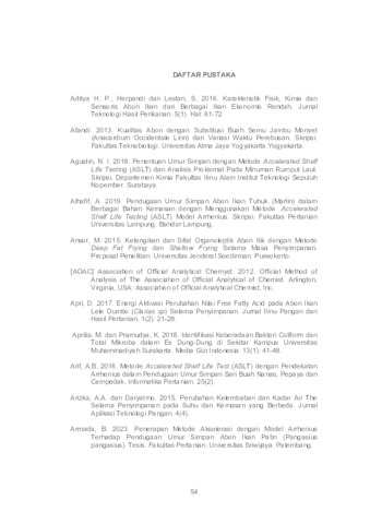 Shredded Duck "Cahyo" is a shredded product made from duck meat produce by PT. Rumah Makan Deltasari Indah. The shelf life of Shredded Duck "Cahyo" can be used as an indication in determining the time and expiration date. Expiration information is one of the important information that must be included in each food packaging. examinations made from the repository to changes in quality decline are carried out to decide the shelf life of Shredded Duck "Cahyo". Therefore, a study was conducted to forecast the shelf life of Shredded Duck "Cahyo" PT Rumah Makan Deltasari Indah. This study's objectives are to decide the critical criteria for determining the shelf life of Shredded Duck "Cahyo" and to forecast the shelf life of Shredded Duck "Cahyo" products stored at different thermal state conditions. In this study, Accelerated Shelf Life Testing utilizing the Arrhenius model was employed. Shredded Duck "Cahyo" packaged in PET jars underwent repository at thermal states of 30˚C, 40˚C, and 50˚C for 28 days, by examinations conducted every 7 days. Key criteria analyzed encompassed water content, Free Fatty Acid (FFA) levels, and total microbial presence. The critical criterion selected was the Free Fatty Acid (FFA) criterion, given its low activation energy (Ea) and high R2 value. outcomes indicated that utilizing the Arrhenius model ASLT approach, the shelf lives of Shredded Duck "Cahyo" at 30˚C, 40˚C, and 50˚C were 58 days, 51 days, and 44 days, respectively. Considering actual repository conditions (20˚C and 25˚C), the average shelf life of Shredded Duck "Cahyo" was decided to be 65.5 days.