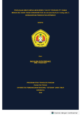 FEBRIANTI, NADYA DWI PUTRI (2024) Pendugaan Umur Simpan Abon Bebek "Cahyo" Produksi PT. Rumah Makan Deltasari Indah dengan Metode Accelerated Shelf-Life Testing (ASLT) Berdasarkan Pendekatan Arrhenius. Undergraduate thesis, UPN Veteran Jawa Timur.