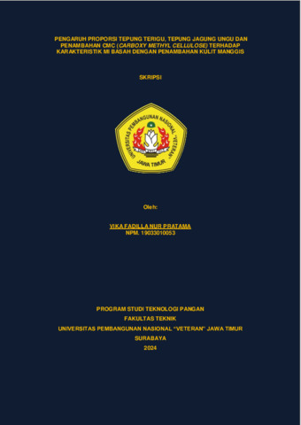 PRATAMA, VIKA FADILLA NUR (2024) PENGARUH PROPORSI TEPUNG TERIGU, TEPUNG JAGUNG UNGU DAN PENAMBAHAN CMC (CARBOXY METHYL CELLULOSE) TERHADAP KARAKTERISTIK MI BASAH DENGAN PENAMBAHAN KULIT MANGGIS. Undergraduate thesis, Universitas Pembangunan Nasional "Veteran" Jawa Timur.