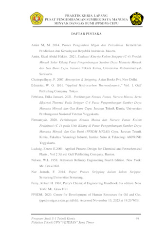 Rahmawati, Alrista LAPORAN PRAKTIK KERJA LAPANG EVALUASI EFISIENSI KOLOM STRIPPER (C-04) DI PUSAT PENGEMBANGAN SUMBER DAYA MANUSIA MINYAK DAN GAS BUMI (PPSDM MIGAS) CEPU. Project Report (Praktek Kerja Lapang dan Magang). UPN Veteran Jatim. (Unpublished)