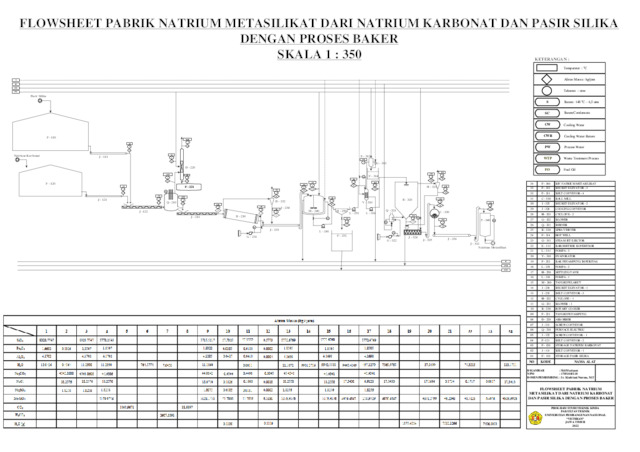 A sodium metasilicate plant, utilizing a baker process with an annual capacity of 40,000 tons, is to be constructed in the JIIPE Manyar region of Gresik, East Java. The plant operates continuously, 24 hours a day, 330 days a year, using silica sand and sodium carbonate as raw materials. Sodium metasilicate has a variety of applications, including as a metal adhesive, in pulp and paper production, as a detergent ingredient, and as an ingredient in other chemical industries. The sodium metasilicate plant process entails the reaction of silica sand and sodium carbonate in an electric furnace at a temperature of 1400°C. Following this, the mixture is cooled in a rotary cooler to a temperature of 150°C and dissolved in a solvent tank. Subsequently, impurities are removed in the settling tank. The solution was concentrated on the evaporator to achieve a concentration level of 70%. The solution was then conveyed to the spray dryer, which was heated to 375°C using hot air from the burner. The solution is contacted in the opposite direction, where hot air is introduced from below (in a countercurrent flow) to facilitate the formation of sodium metasilicate granules (powder). The sodium metasilicate powder, which emerges from the spray dryer at a temperature of 120°C, is conveyed to the cooling system to reduce the temperature to 30°C. The product is then cooled to 30°C. It is stored in a sodium metasilicate.