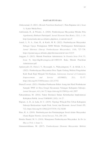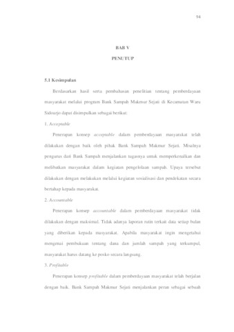 Undang-undang Republik Indonesia Nomor 18 Tahun 2008 menjelaskan bahwa sampah merupakan sisa kegiatan sehari-hari manusia atau proses alam yang berbentuk padat atau semi padat berupa zat organik atau non organik bersifat dapat terurai atau tidak dapat terurai yang dianggap sudah tidak memiliki nilai lagi dan dibuang ke lingkungan. Sejalan dengan undang-undang tersebut pemerintah Kabupaten Sidoarjo berusaha untuk mengurangi jumlah sampah dengan mengelola sampah melalui Dinas Kebersihan dan Pertamanan (DKP) yang bekerjasama dengan Badan Lingkungan Hidup (BLH) dan diwujudkan dengan suatu pengelolaan yang disebut dengan Bank Sampah. Tujuan penelitian ini adalah untuk mengetahui bagaimana pemberdayaan melalui program bank sampah makmur sejati di desa waru Kabupaten Sidoarjo Penelitian ini menggunakan pendekatan kualitatif. Teknik pengumpulan data dalam penelitian ini menggunakan teknik triangulasi seperti observasi, wawancara serta dokumentasi. Teknik analisis data didalam penelitian ini menggunakan model miles and huberman yang terdiri dari pengumpulan data, kondensasi data, penyajian data dan kesimpulan data. Penelitian ini menghasilkan temuan menarik diantaranya adalah: 1) Penerapan konsep acceptable dalam pemberdayaan masyarakat telah dilakukan dengan baik oleh pihak Bank Sampah Makmur Sejati. 2) Penerapan konsep accountable dalam pemberdayaan masyarakat tidak dilakukan dengan maksimal dikarenakan tidak adanya laporan rutin terkait data setiap bulan yang diberikan kepada masyarakat 3) Penerapan konsep profitable dalam pemberdayaan masyarakat telah berjalan dengan baik. Bank Sampah Makmur Sejati menjalankan peran sebagai sebuah program yang dapat memberikan keuntungan ekonomis bagi masyarakat lewat penukaran sampah menjadi uang dengan cara ditabung. 4) Penerapan konsep sustainable dalam pemberdayaan masyarakat telah berjalan namun belum terlalu optimal. Bank Sampah Makmur Sejati memang dapat mengatasi segala hambatan dan permasalahan yang dihadapi secara mandiri. 5) Penerapan konsep replicable dalam pemberdayaan masyarakat sudah berjalan dengan baik. Penyaluran dana tabungan kepada masyarakat berjalan lancar sehingga masyarakat dapat mengambil tabungan mereka kapanpun. Kata kunci : Pemberdayaan Masyarakat, Potensi Desa, Bank sampah