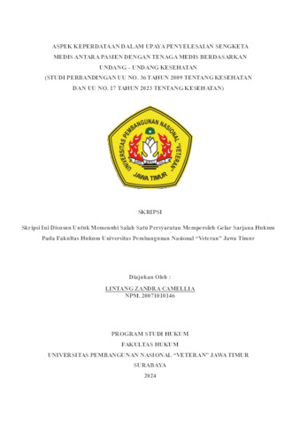 Camellia, Lintang Zandra (2024) Aspek Keperdataan dalam Upaya Penyelesaian Sengketa Medis Antara Pasien dengan Tenaga Medis Berdasarkan Undang-Undang Kesehatan (UU No. 36 Tahun 2009 tentang Kesehatan dan UU No. 17 Tahun 2023). Undergraduate thesis, UPN Veteran Jawa Timur.