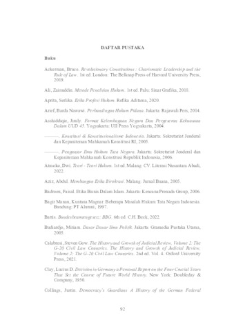 The Constitutional Court has an important role as an institution in carrying out checks and balances and also a representation of democracy itself so that the performance of constitutional judges must be maintained by a code of ethics. The code of ethics is a form of supervision of constitutional judges so that the implementation of the duties and functions of judges can be carried out in accordance with the law (regulations). Indonesia and Germany have the same legal system and also a similar historical background where both countries have experienced authoritarian regimes, and the Constitutional Court is present to prevent this from reappearing. The results show that the Constitutional Court Regulation related to the guidelines for the code of ethics for constitutional judges refers to The Bangalore Principles 2002. The Constitutional Court Regulation itself has the same position as the Presidential Regulation “conditionally”. The legal literature of the Constitutional Court Regulation actually has the nature of internal regelingen, which means that the character of the PMK is only binding on an institution. In contrast, Germany does not regulate in detail in a regulation as found in Indonesia. Germany regulates the code of ethics in the Bundesdisziplinargesetz - BDG which is a law in federal disciplinary matters that applies mutatis mutandis with the Deutsches Richtergesetz - DRiG. The distinguishing aspects that become comparative variables between Indonesia and Germany are the authority to prosecute violations of the code of ethics of constitutional judges, the sanctions given, the judicial process or trial, the legal products resulting from the trial process, the subject who is entitled to file a report. Keywords: Comparative Law, Code of Ethics, Constitutional Court Judges