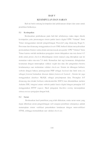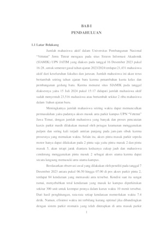 Akses masuk parkir di Universitas Pembangunan Nasional “Veteran” Jawa Timur mengalami kendala karena jumlah mahasiswa yang tidak sebanding dengan kecepatan akses menyebabkan antrian panjang pada akses masuk parkir. Sistem parkir manual menggunakan karcis kertas memperlambat proses dan menimbulkan masalah keamanan serta limbah. Observasi menunjukkan bahwa setiap kendaraan membutuhkan rata-rata 7.4 detik untuk check-in, sementara sistem yang sudah menerapkan parkir otomatis di kampus lain hanya memerlukan sekitar 4 detik. Selain itu, pencurian kendaraan juga menjadi masalah serius karena kelalaian pemeriksaan keamanan. Peneliti mengusulkan solusi sistem parkir karcis digital berbasis web untuk meningkatkan efisiensi dan keamanan, menggantikan karcis kertas dengan barcode kartu tanda mahasiswa yang dipindai, dan mencocokkan data identitas pemilik kendaraan dengan sistem terintegrasi. Sistem parkir karcis digital dirancang menggunakan metode pengembangan Waterfall dan UML, serta diimplementasikan dengan framework Laravel dan database MySQL. Hasil pengujian menunjukkan waktu rata-rata 4.5 detik untuk check-in, lebih cepat dibandingkan sistem manual. Validasi keamanan ditingkatkan melalui verifikasi wajah dan data diri saat check-out. Sistem ini diintegrasikan dengan perangkat IoT berbasis mikrokontroller ESP32 melalui Arduino IDE, menggunakan HTTP request untuk komunikasi dan diuji menggunakan blackbox testing menunjukkan semua usecase berfungsi dengan baik.