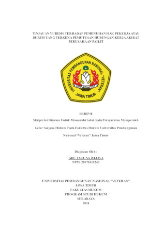 Wijaya, Ade Taruna (2024) TINJAUAN YURIDIS TERHADAP PEMENUHAN HAK PEKERJA ATAU BURUH YANG TERKENA PEMUTUSAN HUBUNGAN KERJA AKIBAT PERUSAHAAN PAILIT. Undergraduate thesis, Universitas Pembangunan Nasional "Veteran" Jawa Timur.