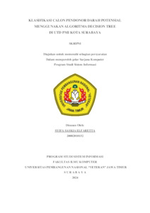 Darah merupakan komponen yang vital dalam tubuh manusia. Kurangnya jumlah darah pada tubuh akan mempengaruhi kerja dari organ lain. Oleh karena itu, PMI berperan aktif dalam menyediakan kebutuhan stok darah nasional. Untuk memastikan bahwa darah yang diterima oleh resipien aman dan berkualitas baik, maka perlu dilakukan klasifikasi calon pendonor darah potensial. Skripsi ini menggunakan beberapa algoritma Decision Tree dalam proses klasifikasi data. Algoritma yang digunakan adalah CART, C4.5, dan Random Forest. Masing-masing algoritma tersebut akan ditambahkan dengan metode oversampling SMOTE dan metode Random Search CV, sehingga terbentuk sembilan skenario. Hasil perbandingan dari sembilan skenario menunjukkan bahwa algoritma Random Forest tanpa bantuan SMOTE dan Random Search CV memiliki nilai terbaik dibandingkan skenario lainnya. Algoritma Random Forest mendapatkan akurasi dengan nilai 97%, AUC ROC dengan nilai 99%, dan tidak terdeteksi overfitting. Oleh karena itu, algoritma Random Forest diimplementasikan dalam sistem klasifikasi calon pendonor darah potensial berbasis web. Hasil uji validasi sistem menunjukkan akurasi dengan angka 97%. Kata Kunci: Klasifikasi, Calon Pendonor Potensial, Decision Tree, CART, C4.5, Random Forest, UTD PMI Kota Surabaya