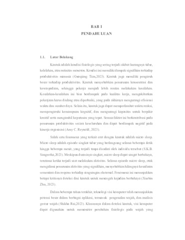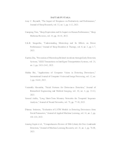 Kantuk merupakan salah satu faktor utama yang mempengaruhi kinerja dan keselamatan, terutama dalam aktivitas berkendara dan tingkat produktifitas. Penelitian ini mengembangkan sistem klasifikasi wajah kantuk menggunakan parameter wajah seperti Eye Aspect Ratio (EAR) dan Mouth Aspect Ratio (MAR), serta algoritma Long Short-Term Memory (LSTM). Data dikumpulkan melalui video wajah subjek dan parameter wajah dihitung dari landmark wajah yang diekstraksi menggunakan pustaka dlib. Model LSTM dipilih karena kemampuannya dalam menangkap pola temporal penting dalam mendeteksi perubahan kondisi kantuk dari waktu ke waktu. Dengan urutan data lima frame sebagai input, dataset dibagi menjadi 80% data pelatihan dan 20% data uji serta validasi. Hasil eksperimen menunjukkan bahwa model LSTM mampu mendeteksi kantuk dengan akurasi yang tinggi, memperlihatkan bahwa kombinasi EAR dan MAR efektif dalam mengidentifikasi kondisi kantuk. Sistem ini diharapkan dapat diterapkan dalam sistem peringatan dini untuk pengemudi dan pemantauan karyawan, memberikan kontribusi signifikan dalam bidang deteksi kantuk dengan menggunakan algoritma LSTM dan parameter wajah. Kata kunci: Deteksi Kantuk, Eye Aspect Ratio (EAR), Mouth Aspect Ratio (MAR), Long Short-Term Memory (LSTM), Klasifikasi Wajah.
