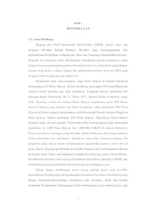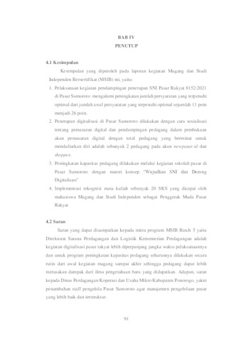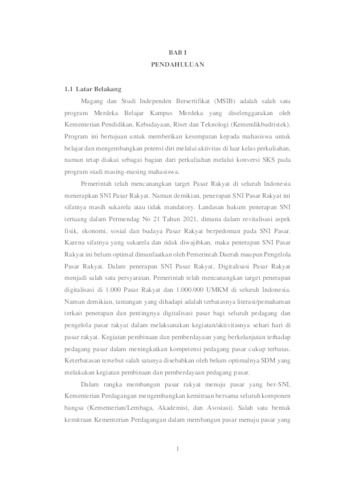 Magang dan Studi Independen Bersertifikat (MSIB) adalah sebuah inovasi yang dibuat oleh KEMENDIKBUDRISTEK dan diluncurkan sebuah kebijakan untuk mentransformasi sistem Pendidikan tinggi di Indonesia untuk menghasilkan lulusan – lulusan terbaik yang lebih relevan di dalam bidangnya. Program ini memberi kesempatan bagi mahasiswa untuk menguasai berbagai bidang keilmuan yang berguna sebagai bekal dalam memasuki dunia kerja maupun berwirausaha. Penggerak Muda Pasar Rakyat merupakan program dari Kementerian Perdagangan untuk melakukan pendampingan penerapan SNI 8152 Pasar Rakyat di beberapa lokasi pasar rakyat, penerapan digitalisasi pasar rakyat, dan peningkatan kapasitas pedagang di pasar rakyat. Penerapan SNI 8152:2021 di Pasar Sumoroto mengalami peningkatan dari jumlah awal 11 poin persyaratan terpenuhi optimal menjadi 26 poin persyaratan terpenuhi optimal. Digitalisasi pasar rakyat dilakukan dengan sosialisasi tentang digitalisasi pasar rakyat dan pendampingan pembukaan akun pemasaran digital bagi para pedagang pasar. Peningkatan kapasitas pedagang dilakukan melalui kegiatan Sekolah Pasar. Kata kunci: SNI Pasar Rakyat, digitalisasi pasar rakyat, sekolah pasar.