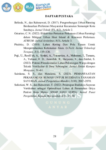 Syabarina, Ahyaniah Dewi (2024) PEMANFAATAN RUANG TERBUKA SEBAGAI PERTANIAN PERKOTAAN YANG BERKELANJUTAN. Universitas Pembangunan Nasional "Veteran" Jawa Timur, Surabaya. (Unpublished)
