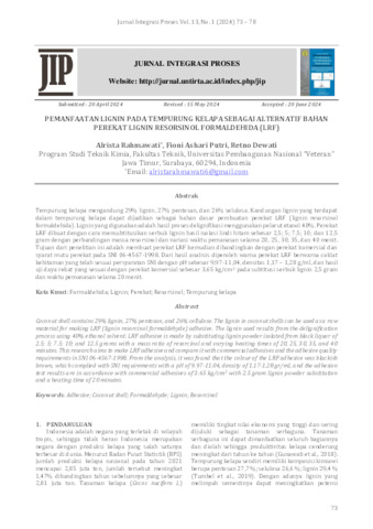 Rahmawati, Alrista and Putri, Fioni Ashari (2024) PEMANFAATAN LIGNIN PADA TEMPURUNG KELAPA SEBAGAI ALTERNATIF BAHAN PEREKAT LIGNIN RESORSINOL FORMALDEHIDA (LRF). UNSPECIFIED thesis, UNSPECIFIED.