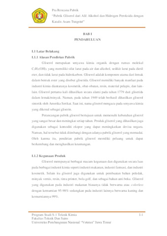 PRA RENCANA PABRIK GLISEROL DARI ALIL ALKOHOL DAN HIDROGEN PEROKSIDA DENGAN KATALIS ASAM TUNGSTAT KAPASITAS 150000 TON/TAHUN