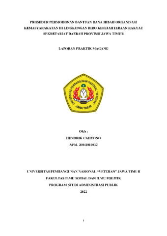 Dwiyanti, HENDRIK (2024) PROSEDUR PERMOHONAN BANTUAN DANA HIBAH ORGANISASI KEMASYARAKATANDI BIRO LINGKUNGAN BIRO KESEJAHTERAAN RAKYAT SEKRETARIAT DAERAH PROVINSI JAW ATIMUR. UNIVERSITAS PEMBAGUNAN NASIOANAL "VETERAN" JAWA TIMUR.