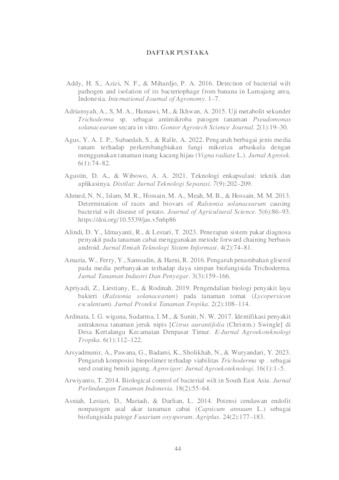 Chili has quite high economic value and market demand. Chili production which increased by 115,250 tons in 2022 must be maintained properly. Problems with chili cultivation such as attacks by the pathogen Ralstonia solanacearum which causes bacterial wilt disease can be controlled by using biological agents such as Trichoderma sp. which in addition to acting as a biological agent can also produce phytohormones that stimulate plant growth (Plant Growth Promoting Fungi). Trichoderma sp. in its growth requires a substrate as energy, the use of bran and biochar which can be a medium for the cultivation of Trichoderma sp. as a coating material in seed encapsulation needs to be developed. The benefits of encapsulation in seeds are that it can protect seeds from environmental influences during the germination period. The purpose of this study was to determine the ability of bran and biochar as coating materials for chili seed encapsulation, as well as the ability of Trichoderma sp. as an active ingredient in seed encapsulation in controlling bacterial wilt disease Ralstonia solanacearum. The experimental design used was a Completely Randomized Design (CRD) with four treatments in the form of P01 (non-encapsulated seeds). P02 (seeds soaked in Trichoderma sp. 106 conidia/mL), P1 (coating material bran + Trichoderma sp. 106 conidia/mL), and P2 (coating material biochar + Trichoderma 106 conidia/mL). The treatment was repeated five times with six replications for each unit. The results showed that bran and biochar as coating materials can maintain the viability of Trichoderma sp. and are able to control bacterial wilt disease Ralstonia solanacearum. Keywords: Chili, Seed Encapsulation, Bacterial Wilt Disease, Ralstonia solanacearum, Trichoderma sp.